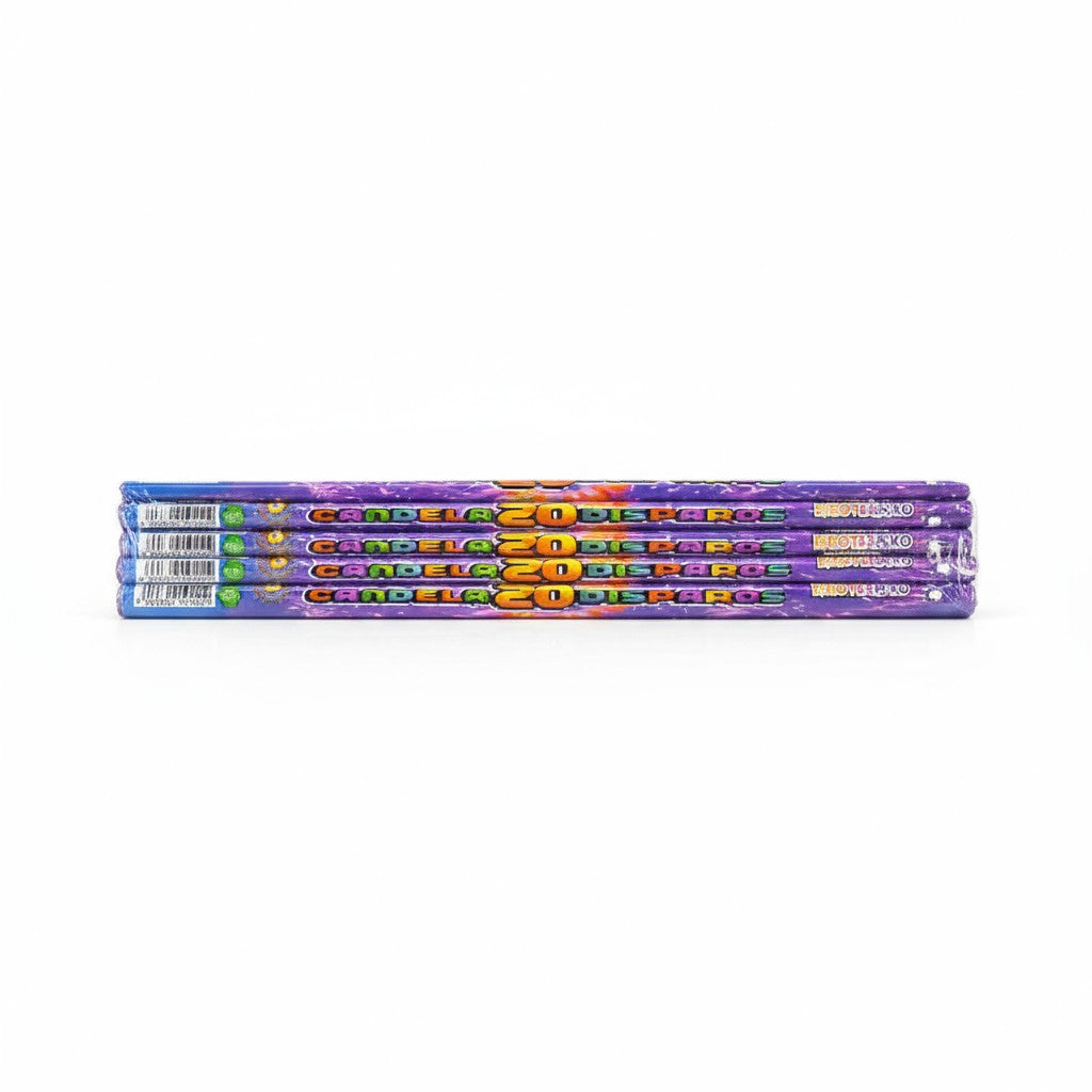 Candela 20 disparos con luces vivas y secuencia equilibrada.